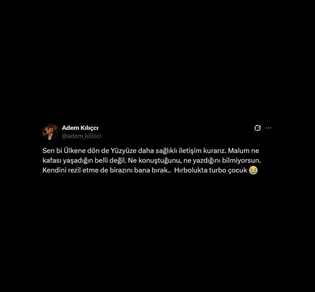 Bu meydan okuma dolu sözlere yanıt, Survivor'ın güçlü sporcusu Adem Kılıçcı'dan gecikmedi. Kılıçcı, sosyal medya hesabından yaptığı cevabi paylaşımda, Turabi'nin yurt dışında bulunmasını hedef aldı ve oldukça sert ifadeler kullandı. Kılıçcı, "Sen bir ülkene dön de yüz yüze daha sağlıklı iletişim kurarız. Hırbolukta turbo çocuk" diyerek karşılık verdi.