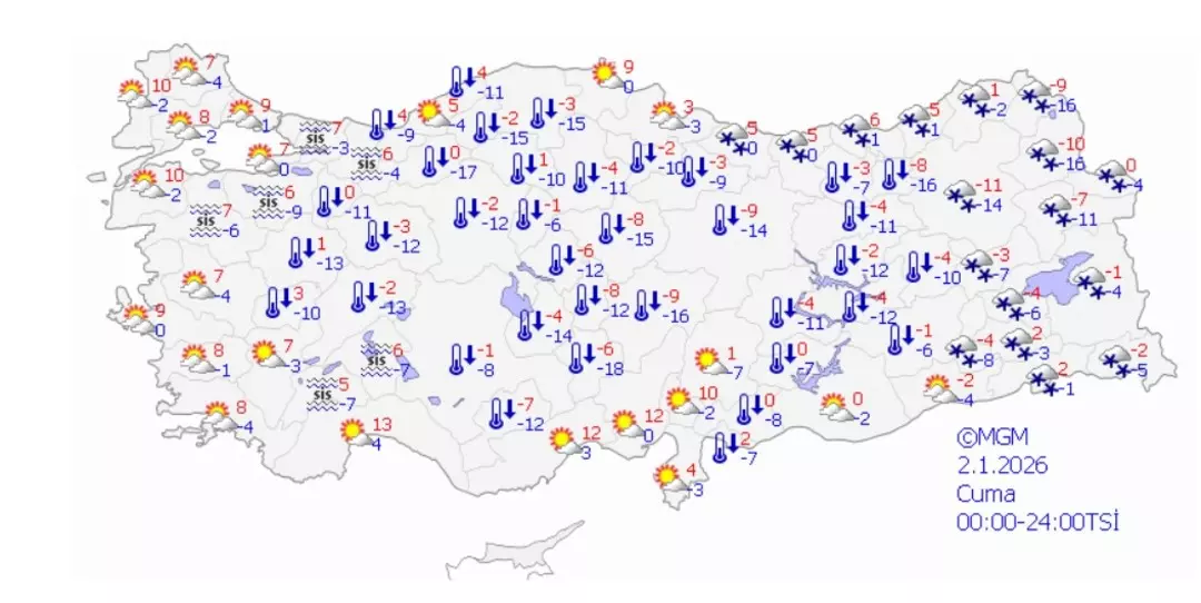 Rusya ve İzlanda üzerinden gelen soğuk hava dalgasının yol açtığı yoğun kar yağışları ve şiddetli don olayları, yurdun birçok bölgesinde etkisini kaybetmeye başlıyor. Meteoroloji Genel Müdürlüğü verilerine göre, yağışlar batı ve iç kesimlerden çekilirken, geride dondurucu soğuklar ve özellikle İç Anadolu'da eksi 18 dereceye varan sıcaklıklar bırakıyor.